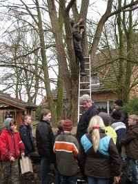 Den Abschluss des Besuches bildete das Befestigen der Kästen an geeigneten Bäumen auf dem Schulgelände. Die Schüler der Umwelt-AG können sich nun gemeinsam mit ihrer Lehrerin Frau Deters auf brutwillige Vögel und deren Jungtiere freuen.
